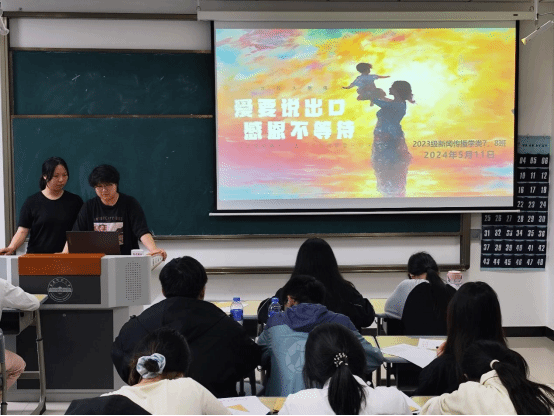 “同學(xué)們,猜一猜明天是什么節(jié)日啊?”“母親節(jié)!”5月11日,新聞傳播學(xué)類專業(yè)2023(7)、(8)班在K202教室開展以“愛要說出口,感恩不等待”為主題的團(tuán)建活動。活動開始前,活動負(fù)責(zé)人、新聞傳播學(xué)類專業(yè)2023(7)、(8)班的班長楊雨霏、朱研溪提前為每位同學(xué)準(zhǔn)備好信紙和信封。朱研溪說:“我們希望通過寫信這種傳統(tǒng)而深情的溝通方式,讓同學(xué)們勇敢表達(dá)自己的心聲,將對母親的愛訴說于筆尖?!睂W(xué)生們觀看一段關(guān)于母愛的感人短片后,...